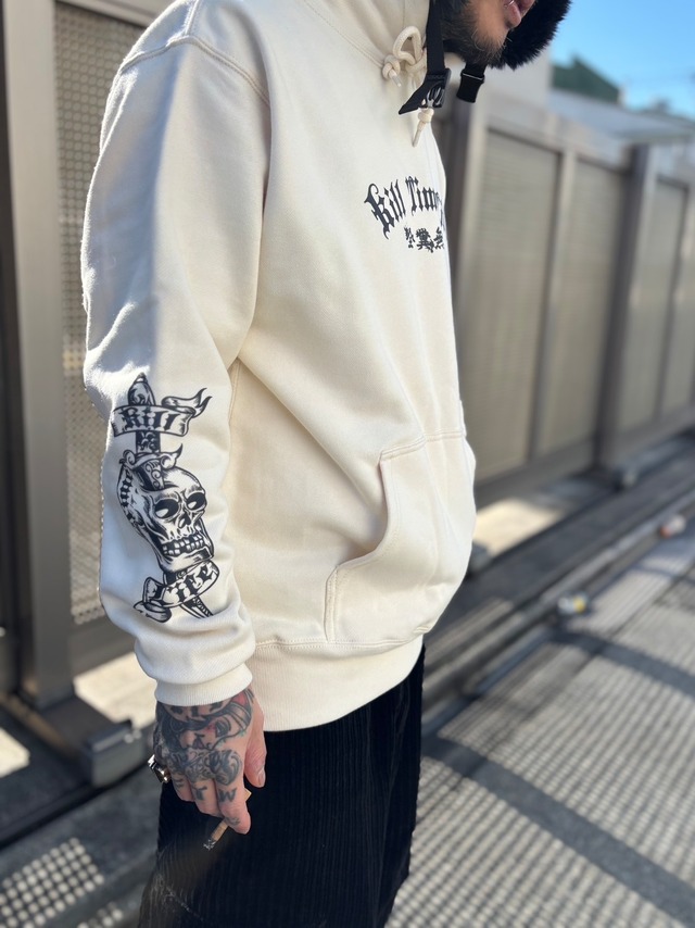 TATTOO Sweat Hoodie<NATURAL> THUNDER ALLEY t/c Manoによる描き下ろしグラフィックを使用したスウェットパーカー。 トラディショナルタトゥーの代表的なモチーフのひとつ “Death Before Dishonor(不名誉な生より、名誉ある生を)” を KILL TIME LIFEの解釈で再構成し、両袖へ大胆にプリントしました。 タトゥーの持つ思想性とストリートウェアとしての存在感を両立させた一枚。 シンプルなホワイトボディながら、着用時に袖のグラフィックが強く主張します。 ヘビーウェイトでしっかりした生地感、裏パイル仕様でさらりとした着心地。 季節を問わず着用でき、長く付き合える一着に仕上がっています。 ナチュラル(生成り)ボディ × ブラックプリント。 ※本商品のご購入者には、KILL TIME LIFEオリジナルステッカーを1枚同封いたします。 【 素材 】 コットン100% 12.7oz(裏パイル) 【 SIZE GUIDE 】 Mサイズ 着丈 69 cm 身幅 55 cm 肩幅 50 cm 袖丈 61 cm Lサイズ 着丈 72 cm 身幅 58 cm 肩幅 53 cm 袖丈 62 cm XLサイズ 着丈 75 cm 身幅 61 cm 肩幅 56 cm 袖丈 63 cm