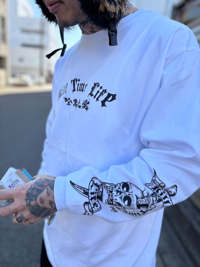 TATTOO Long Sleeve Tshirts<WHITE> THUNDER ALLEY t/c Manoによる描き下ろしグラフィックを使用したロングスリーブTシャツ。 トラディショナルタトゥーの代表的なモチーフのひとつ “Death Before Dishonor(不名誉な生より名誉ある生を)” を KILL TIME LIFEの解釈で再構成し、両袖へ大胆にプリントしました。 タトゥーの持つ思想性とストリートウェアとしての存在感を両立させた一枚。 一見シンプルなホワイトボディながら、着用時に袖のグラフィックが強く主張します。 白ボディ × ブラックプリント。 イベントの空気感をそのまま持ち帰れる、記念的なプロダクトです。 ※本商品のご購入者には、特製ステッカーを1枚同封いたします。 【 素材 】 コットン100% 6.5oz(天竺) 【 SIZE GUIDE 】 Mサイズ 着丈 69 cm 身幅 53 cm 肩幅 48 cm 袖丈 62 cm Lサイズ 着丈 72 cm 身幅 56 cm 肩幅 51 cm 袖丈 63 cm XLサイズ 着丈 75 cm 身幅 59 cm 肩幅 54 cm 袖丈 64 cm