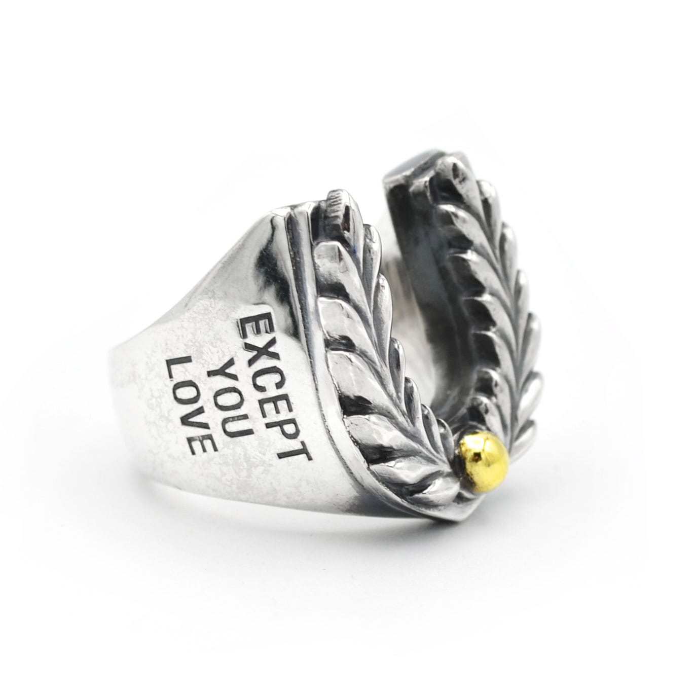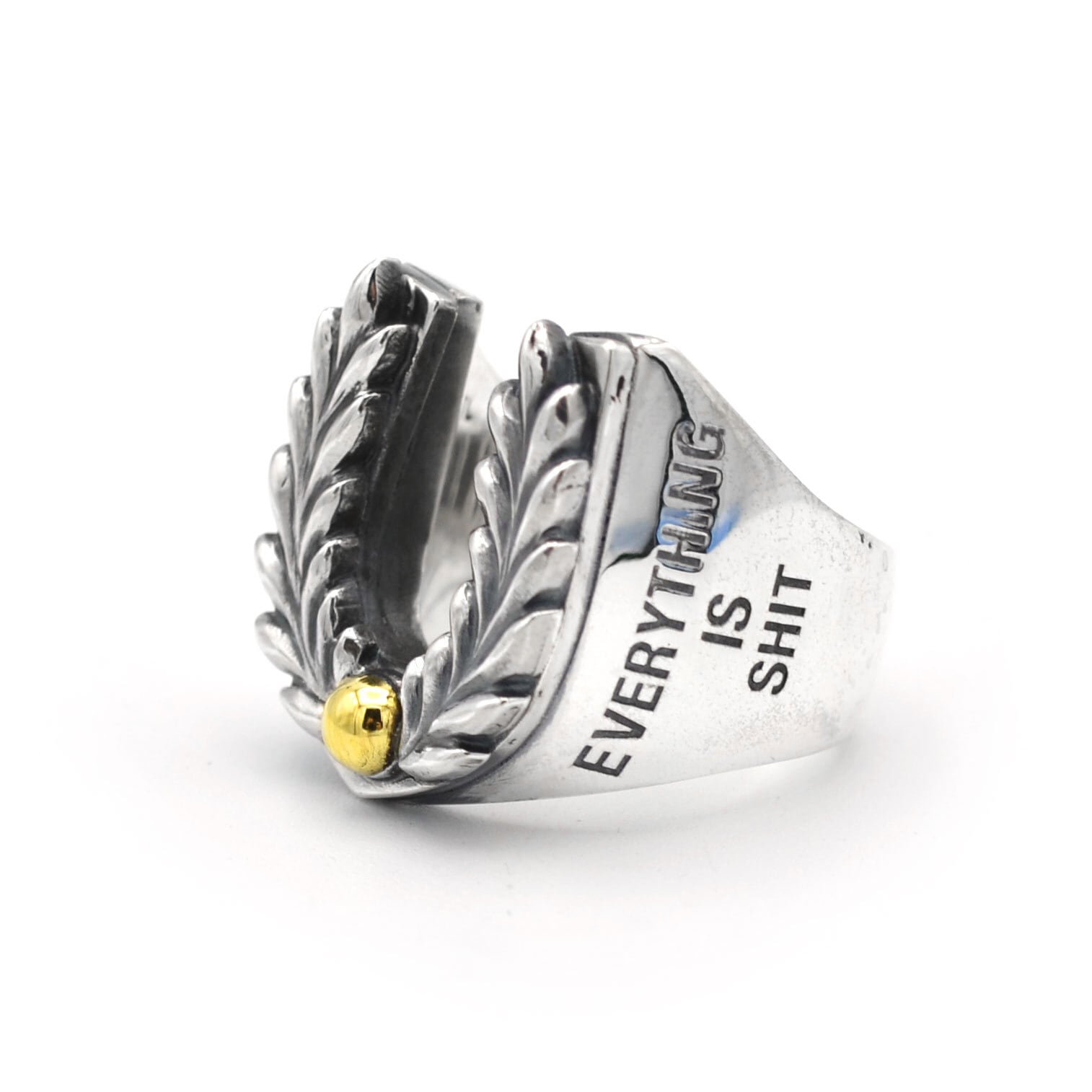 リング側面には「EVERYTHING IS SHIT,EXCEPT YOU LOVE」の文字が刻印されています。ボリュームのあるリングは存在感がありスタイルのアクセントとして活躍します。