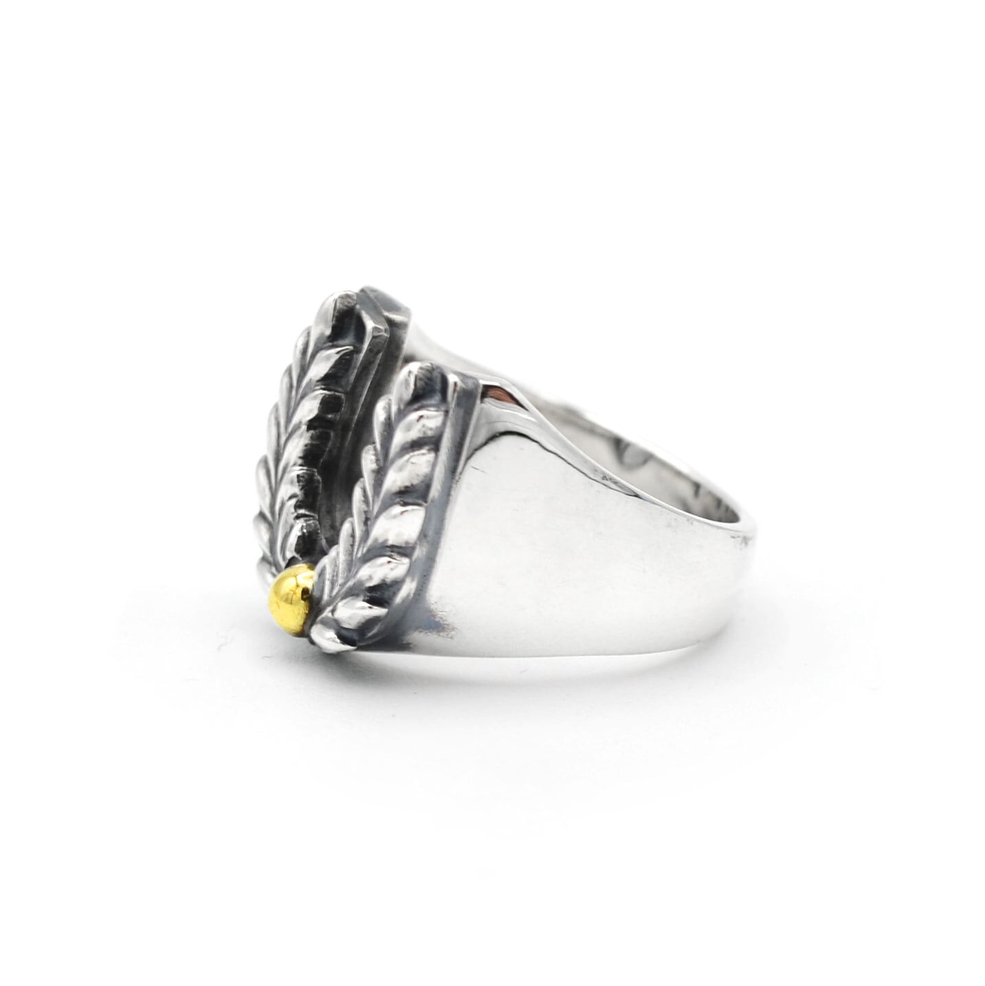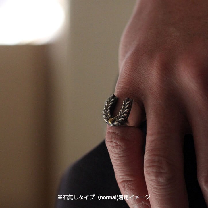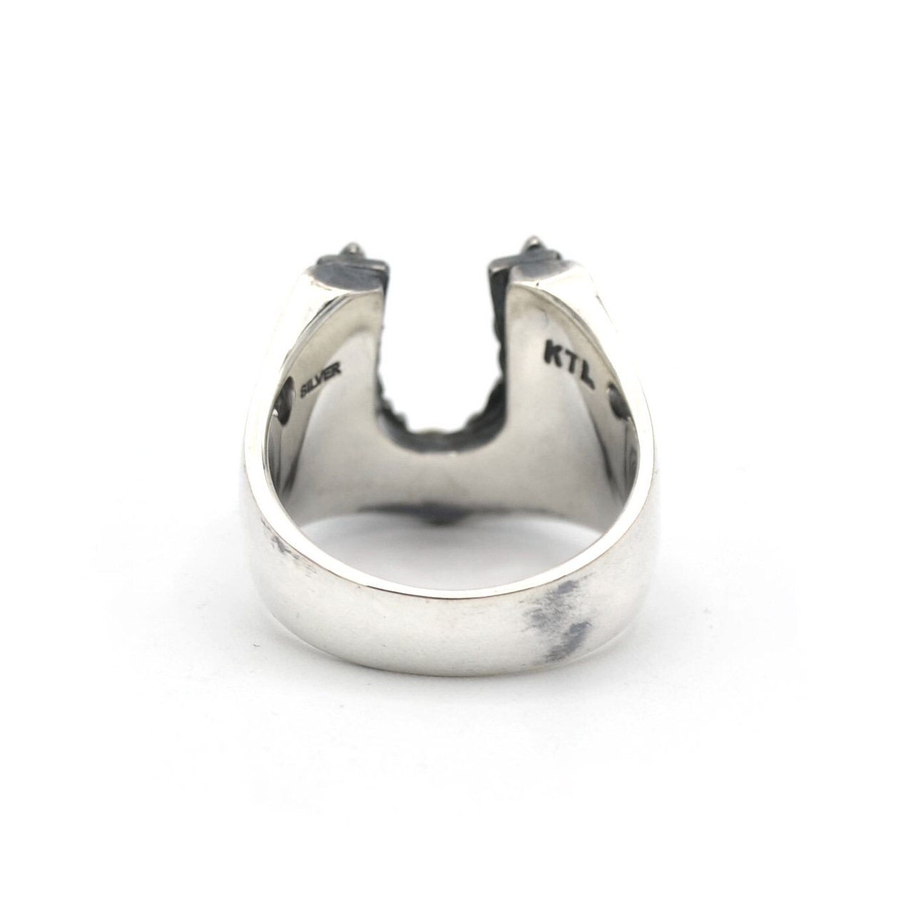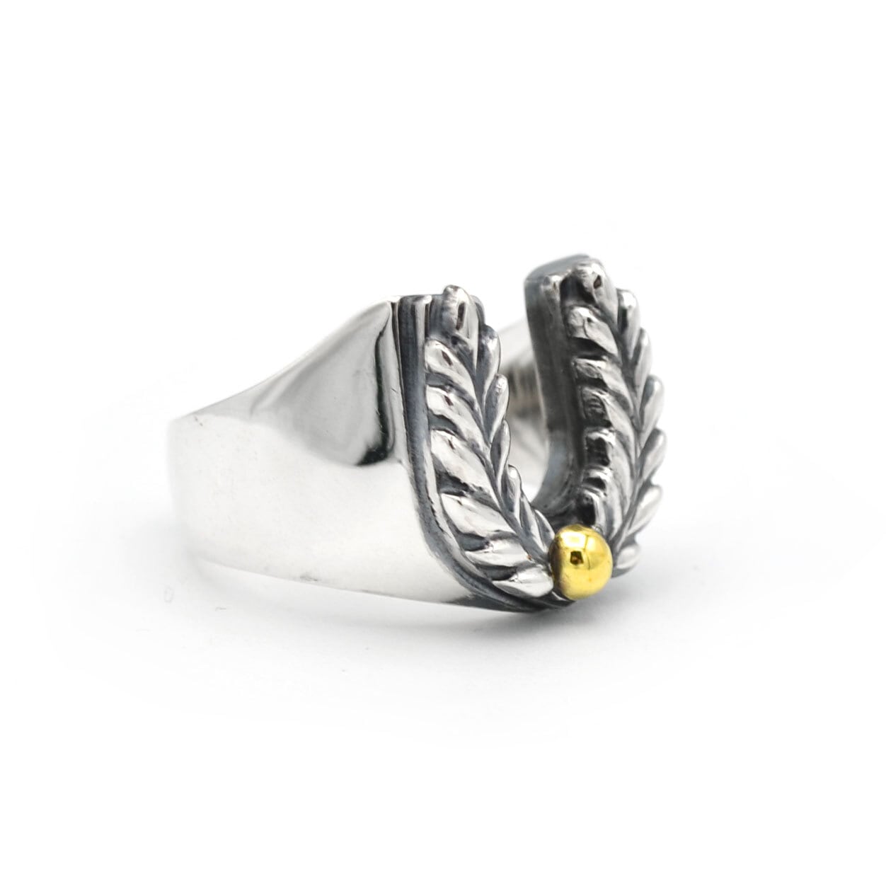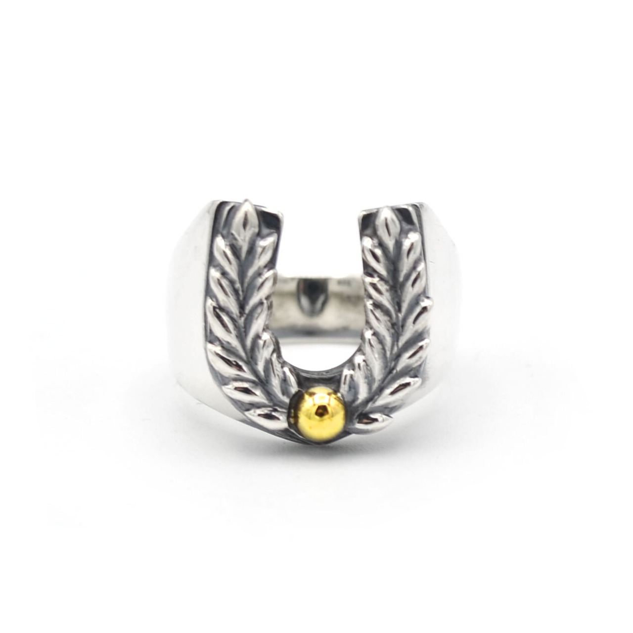 U字型のフォルムから「幸運を受け止める」意味を持ち古くからラッキーアイテムとして海外で親しまれているホースシューと「勝利/栄誉」の象徴lであるlaurel(月桂樹)を組み合わせたKILL TIME LIFEのリングです。