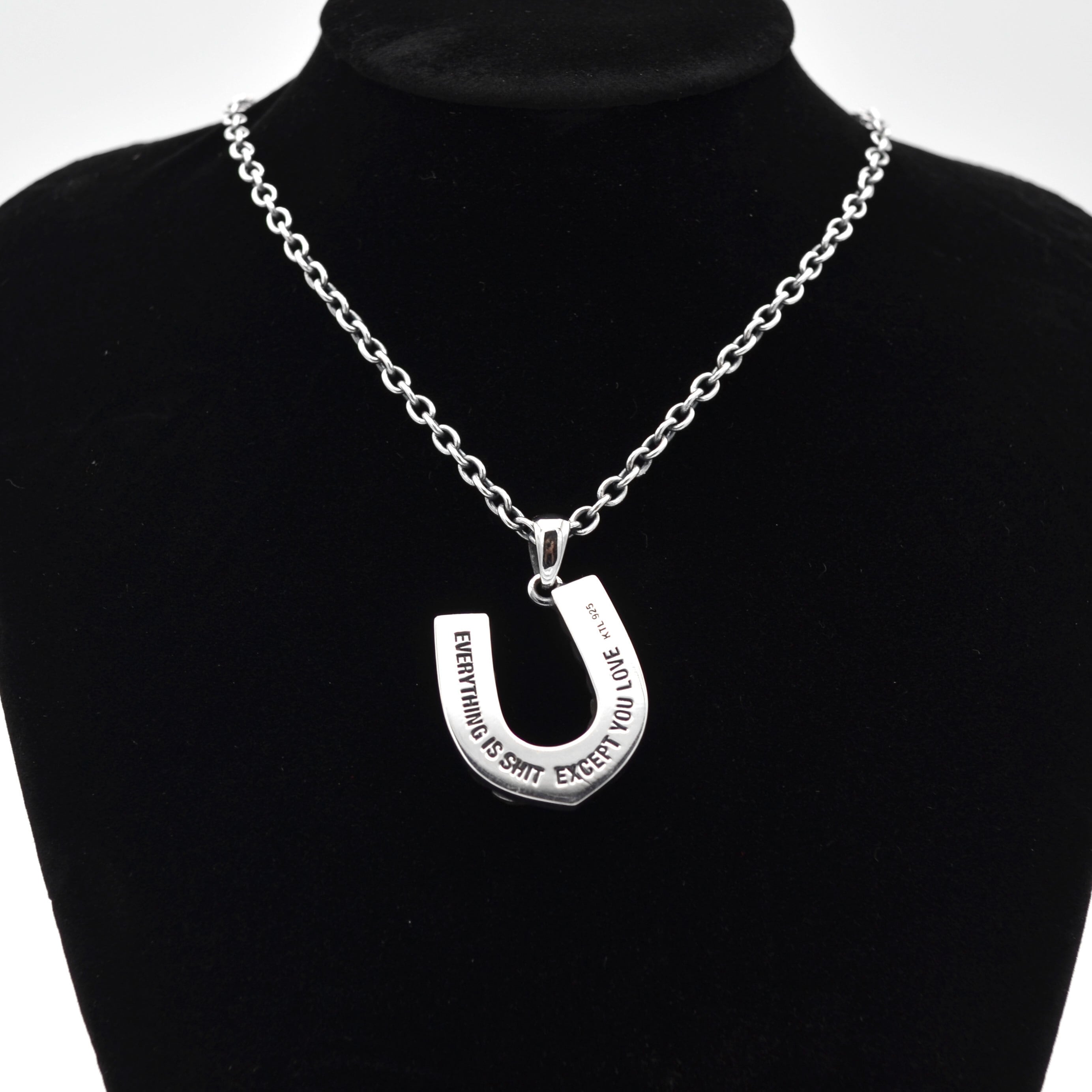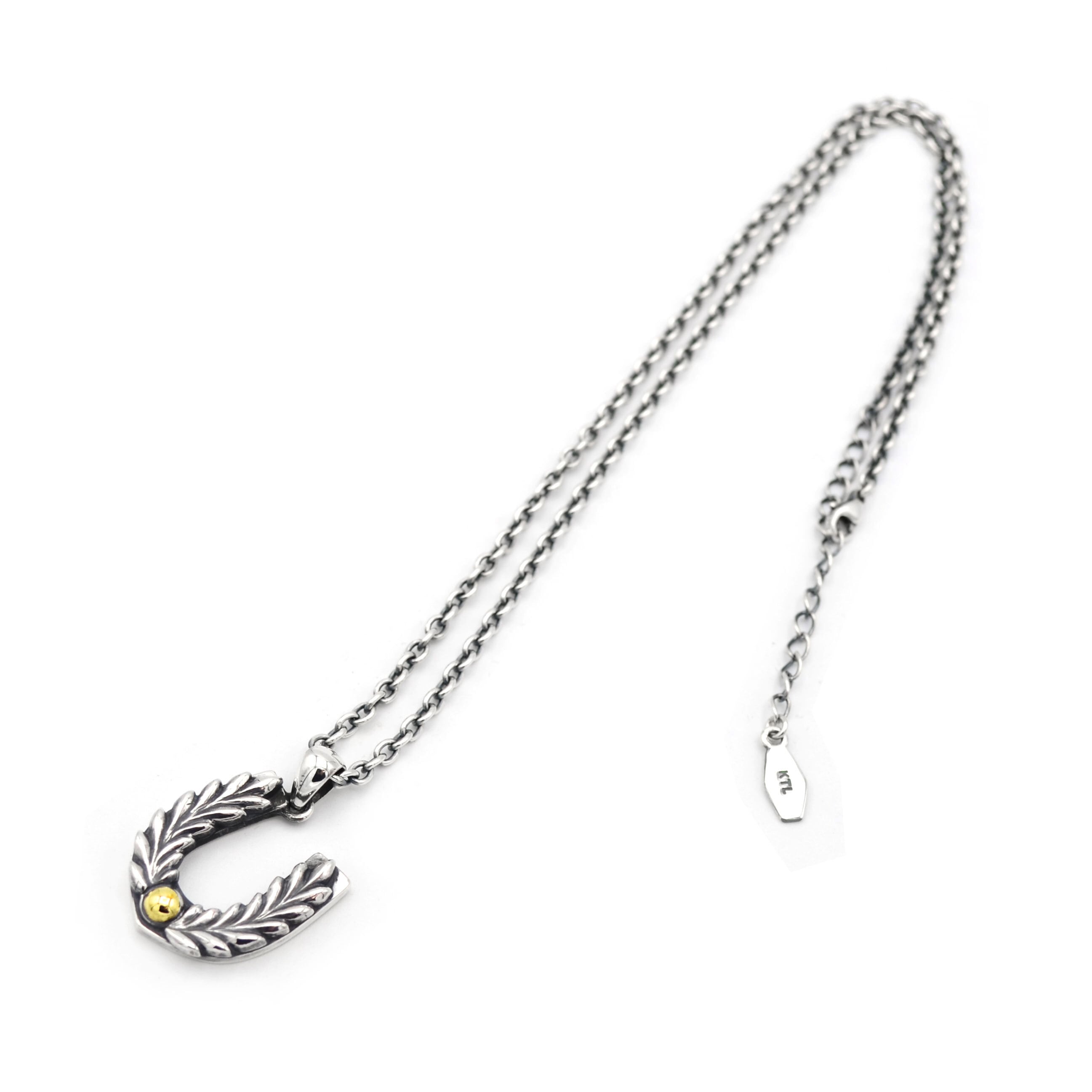 U字型のフォルムから「幸運を受け止める」意味を持ち古くからラッキーアイテムとして海外で親しまれているホースシューと「勝利/栄誉」の象徴lであるlaurel(月桂樹)を組み合わせたKILL TIME LIFEのネックレスです。
