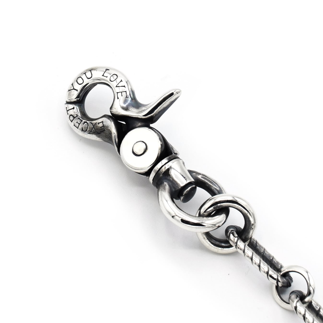 トラス構造のピラミッドスタッズを中央に「EVERYTHING IS SHIT EXCEPT YOU LOVE(愛が無ければ全て糞)」のバナーを刻印したキャッチデザインを採用のKILL TIME LIFEの1stウォレットチェーン。